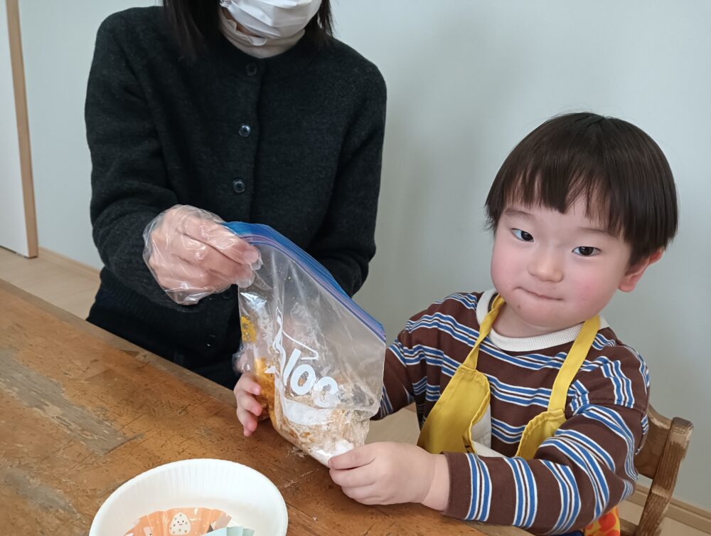 今日は、チクタクキッズで親子クッキングをしました。 簡単で、小さなお子様と一緒にできる『かぼちゃ団子』作りをしました。かぼちゃを手でつぶすところは、「気持ちいいね~」「おもしろいね!」など、親子で会話を楽しみながら作っていましたよ。丸めて、…