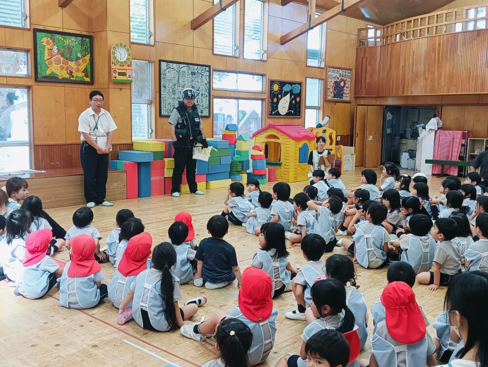 本日は、幼稚園に不審者が来た際の訓練を実施していきました! 園庭で遊んでいた子どもたちは、怪しい人物を見かけると、近くの先生に知らせ、その後放送がなると、ちびっこ広場のドアから静かに逃げることができました。 集会では、アルソックさんから訓練時の様子や逃げるときに大事な話を教えてもらい、【いかのおすし】についてもみんなで振り返ることができました。