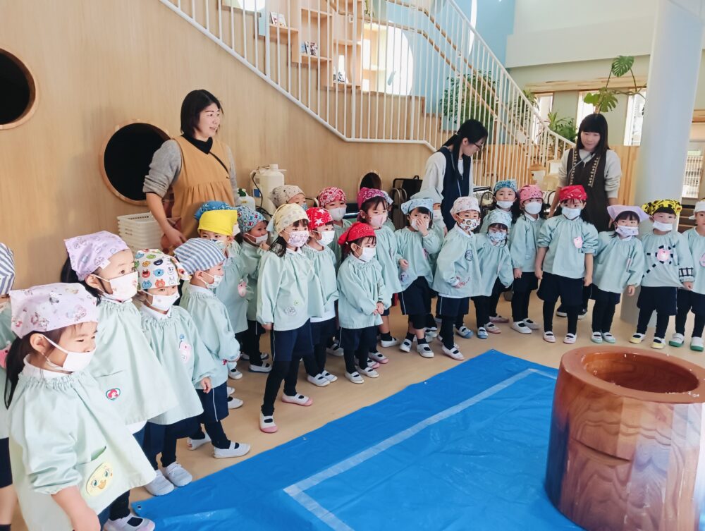 まっしろなふわふわは、子どもたちが楽しみにしている行事のひとつです! 前日から準備していた餅つきの台を見て楽しみにしていた子どもたち☆ 役員の保護者の方が手伝いに来て下さり、大きな杵でもちつきの見本を見せてくれました✨ 子どもたちは、その力強い姿を見て「おお~!!」と大盛り上がり😊 その後、子どもたちも千本杵を使ってもちつき体験を行いました。お友だちがやっている間は、「よいしょ!よいしょ!」と掛け声をかけたり、「ぺったんこ~♪」ともちつきの歌を歌ったりしながら応援しました! 年長さんは、大きな杵を体験しましたが「重かった!」と言いながら一生懸命もちつきをしてくれました。みんなでおいしいおもちを食べ、良い体験ができました☆ 来年も良い年が迎えられますように♬