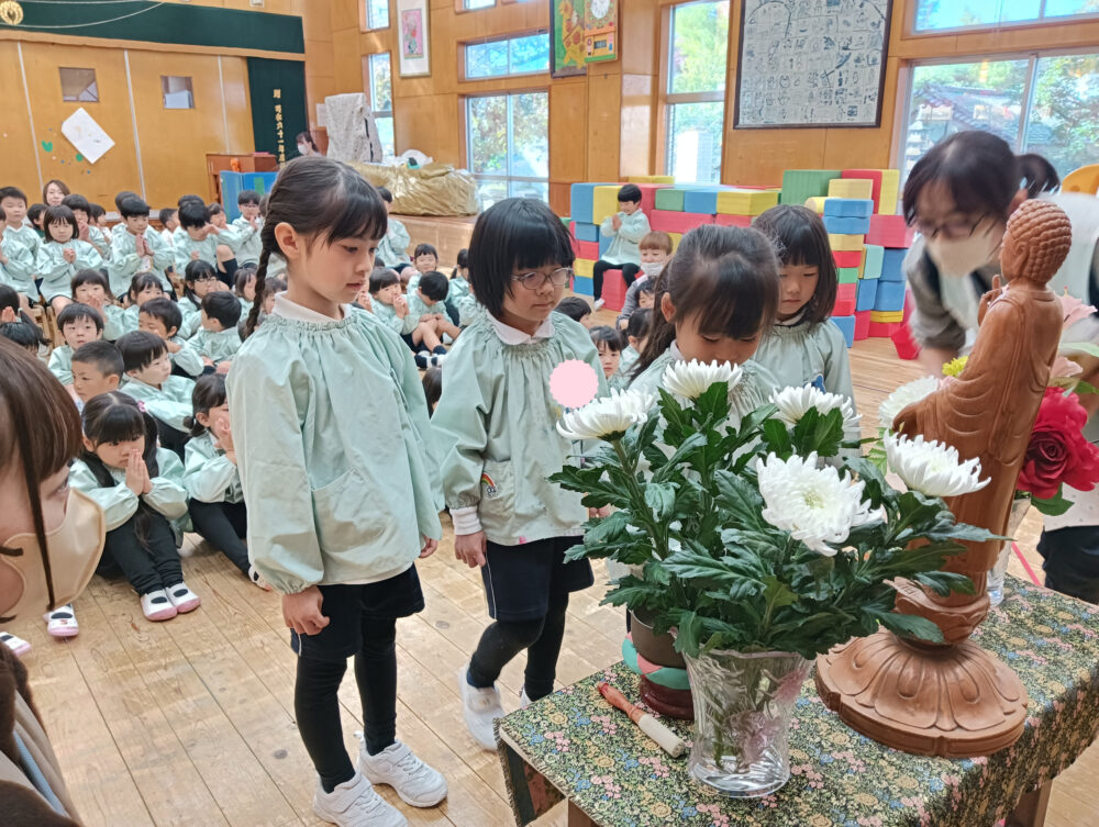 今日は、仏教行事、報恩講を行いました。 報恩講は、みんなが幸せに暮らせるように、心優しく過ごせるように悟りを開いたお釈迦様の考えを広めた親鸞様の命日です。 年中・長さんの代表のお友だちが「献花」「献香」をしてくれました。その後、先生たちのパネルシアターやお話からお釈迦様と親鸞様の話を聞き、みんなで静かに手を合わせて「なかよく優しい気持ちをもってすごすよ」とお空に気持ちを届けました。 みんなでうたった「みていてね」の歌はやさしい歌声が広がりあたたかい気持ちになりました。