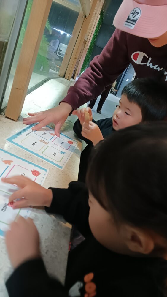 んでいました!また、カワセミ水族館の中にいる生き物を見つけて、シールを貼っていく、スタンプラリーも行いました。生き物を見つけると、お家の方と一緒に嬉しそうにシールを貼って喜んでくれていました!