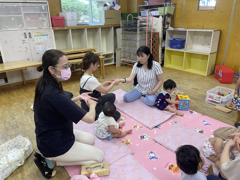 ベビーマッサージとは、赤ちゃんに声をかけながらスキンシップを通して親子の絆を深めていくコミュニケーション方法です。はじめに、保護者の方もお互いに手のひらのマッサージをしてリラックスをしてからスタートしました。今回、行い方のポイントを教えて頂いたので、是非、お家でも行って頂けたらと思います。