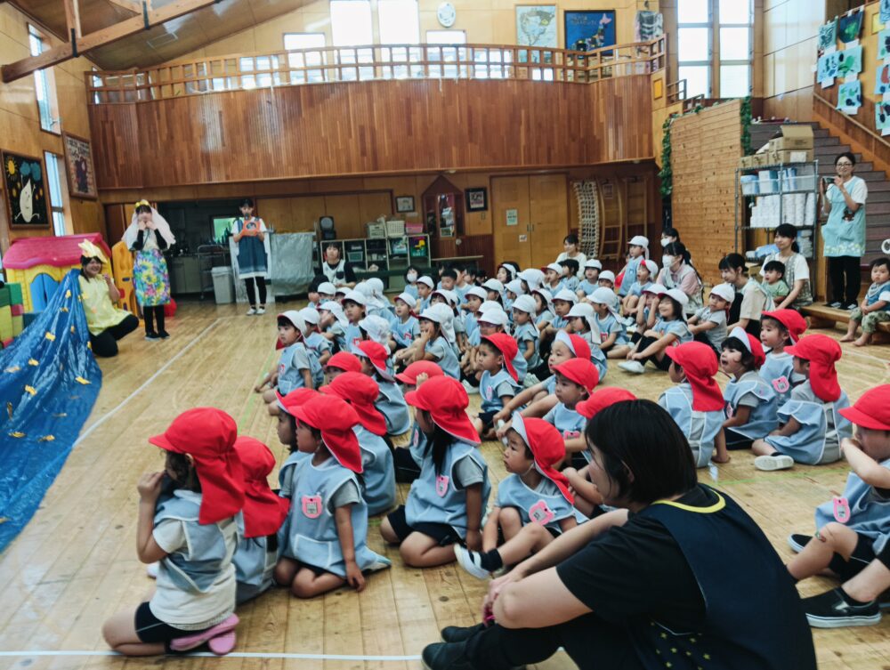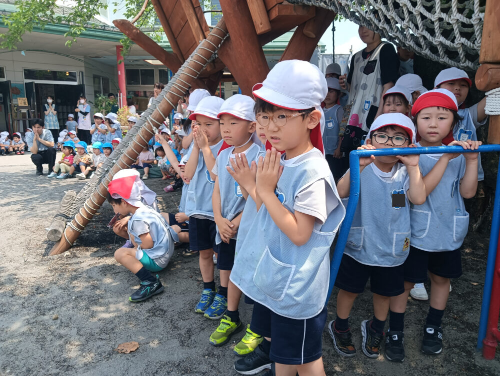 今日はお願い聞いてね笹もやしがありました。先週から七夕の短冊や笹飾りを作って、笹に飾りとても楽しみにしていました。今日はみんなで集まり、七夕の劇を見たり、園庭でみんなの笹飾りを燃やし、みんなのお願い事が煙とともに天にのぼり、お願いが叶いますようにと行いました。燃えて煙が出る空を見上げ、みんな手を合わせて真剣にお願いしていました。みんなの願い事がお空に届きますように・・・☆