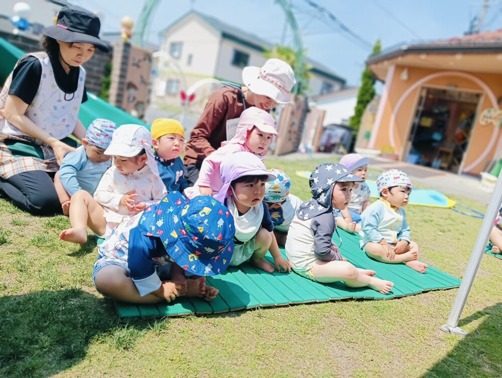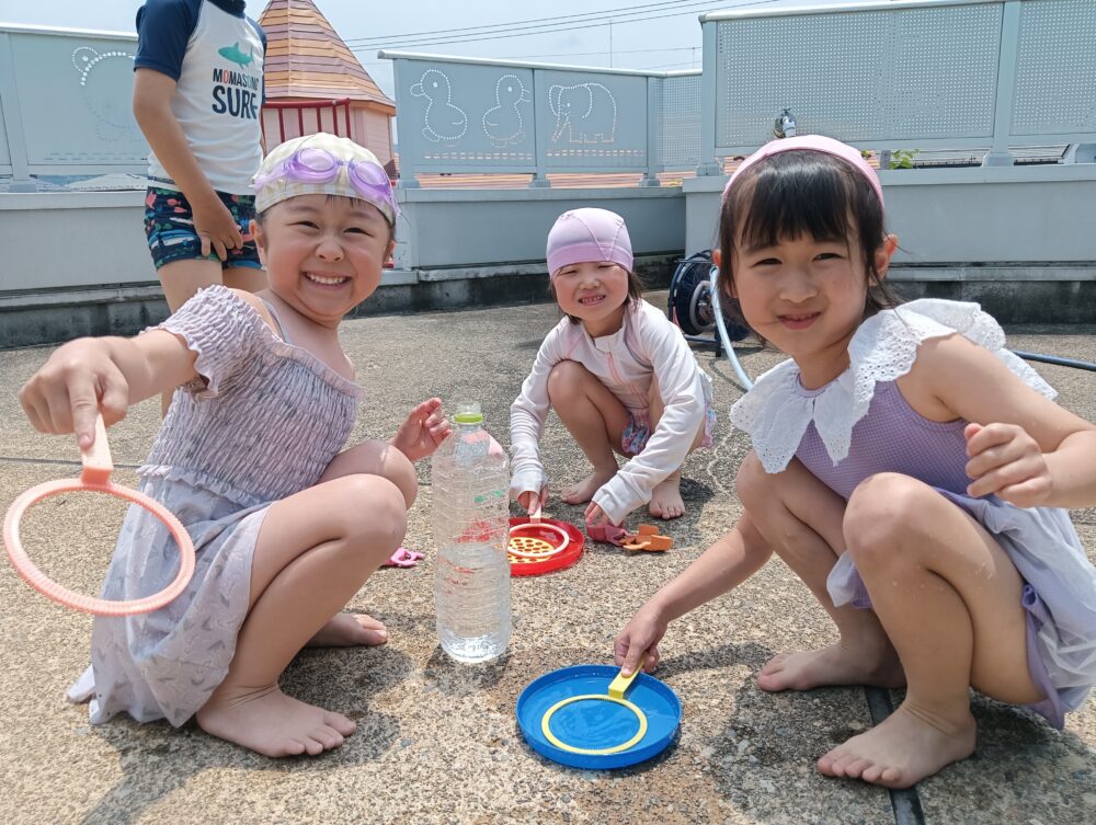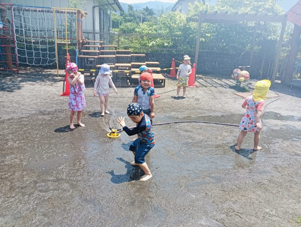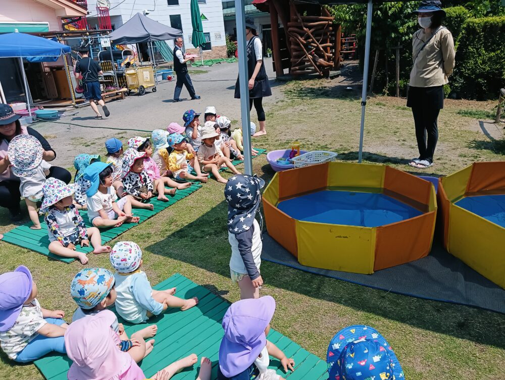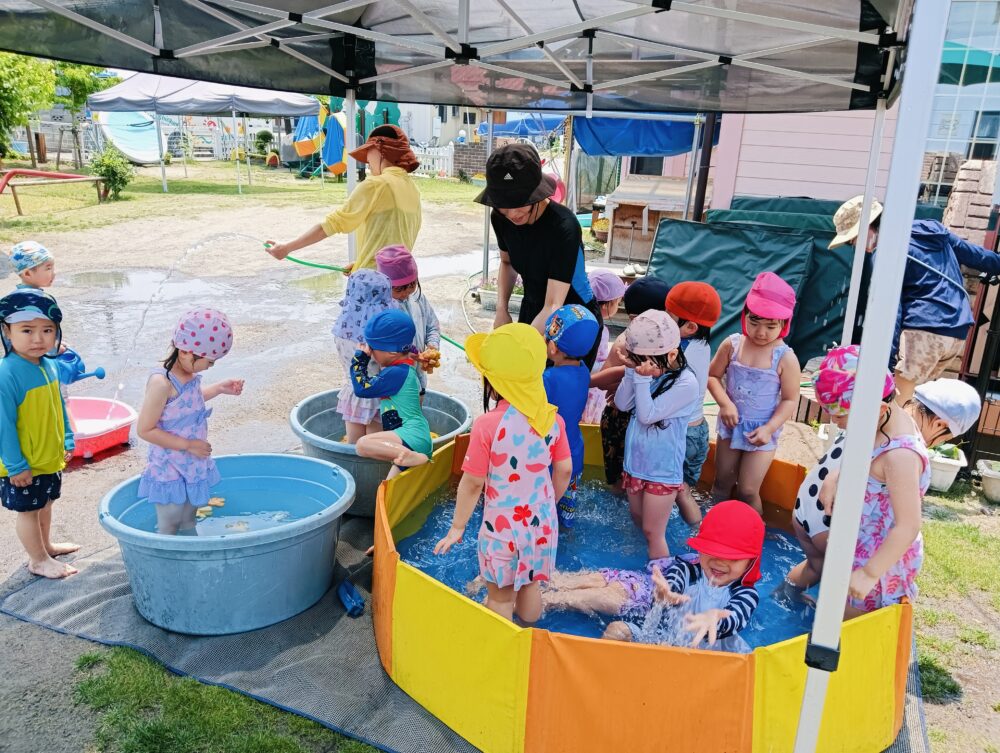 晴れ晴れとしていて、プール日和の中、年中・長さんは2階のプール、年少さんは玄関前、アリスさんはブランコ前にプールを出し、行いましたよ✨