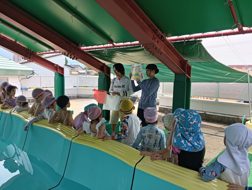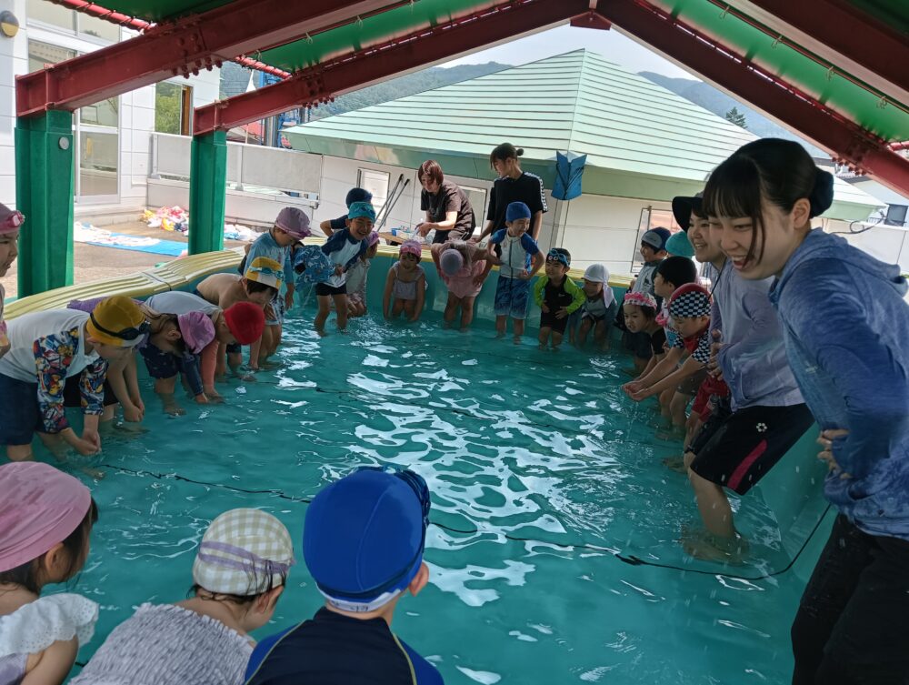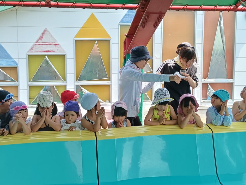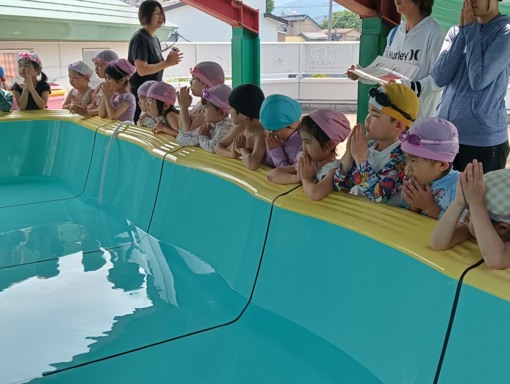 楽しく安全に水遊びが出来るように、塩とお酒を水に入れて、手を合わせて安全祈願をしたり、お約束事を確認して、プールに入りました😊
