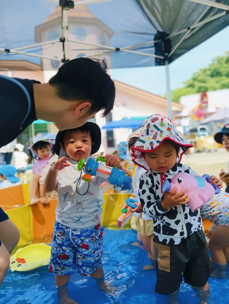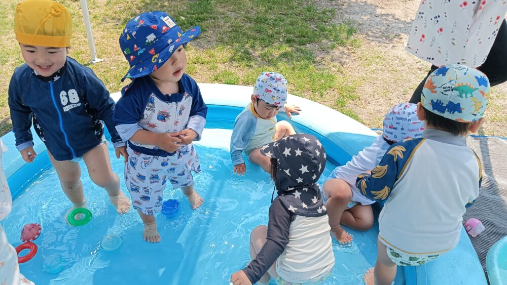 暑かった為、プールの中で水を気持ちよさそうに浴びたり、玩具で遊んだり、泳いだりとそれぞれ楽しんで水遊びをしていましたよ♪