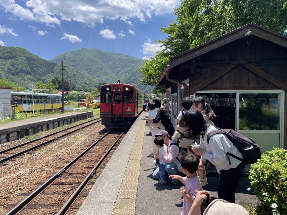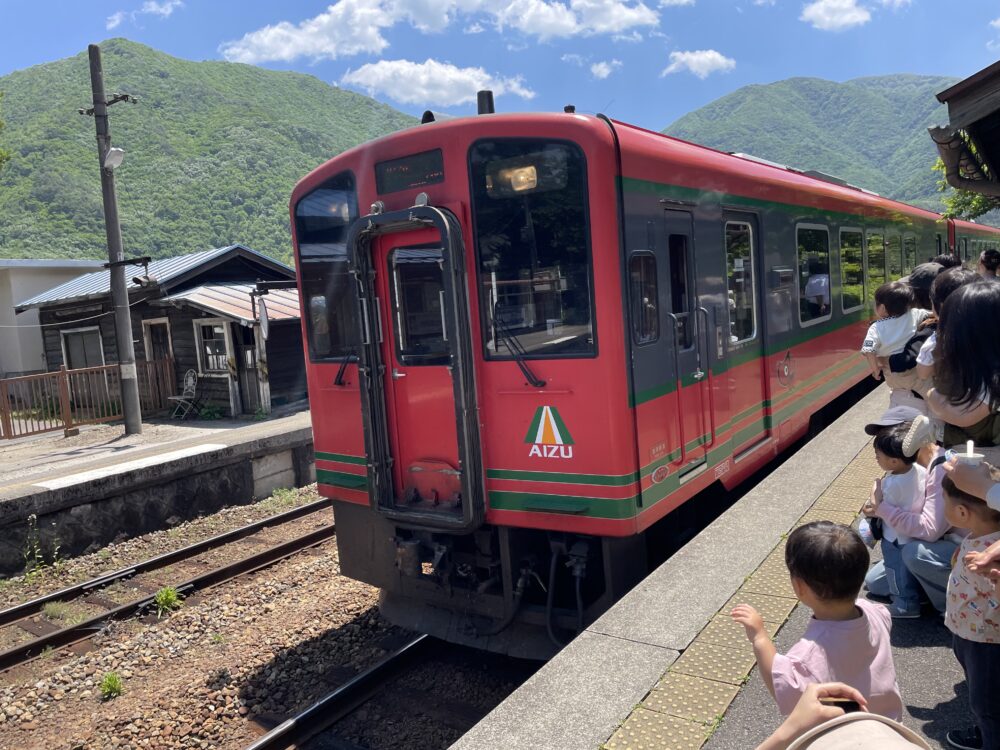 今日は天気が良く、心地よい風が吹く中、チクタクキッズのお友だちと一緒に園外に出掛けてきました。活動として「電車でGO!!」という内容でしたが、電車に乗ってどこにいくのかな?と思いながら来てくれた方もいたかと思います。今日は始めにバスに乗り運動公園(ドーム公園)に行き、公園で遊びました。公園では、ブランコや滑り台など好きな遊具で遊びました。その後、バスに乗り【芦ノ牧温泉駅】に行きました。芦ノ牧温泉駅には、名物の猫駅長さんがいるので、猫駅長を見たり、駅の中を探検しながら電車が来るのを待ちました。普段電車に乗る機会はないという方が多く、電車に乗ることを楽しみに来てくれたので電車に乗る体験ができたことは良い時間となったようです♪西若松までの15分程を、親子で景色を見ながら乗車することができました♪