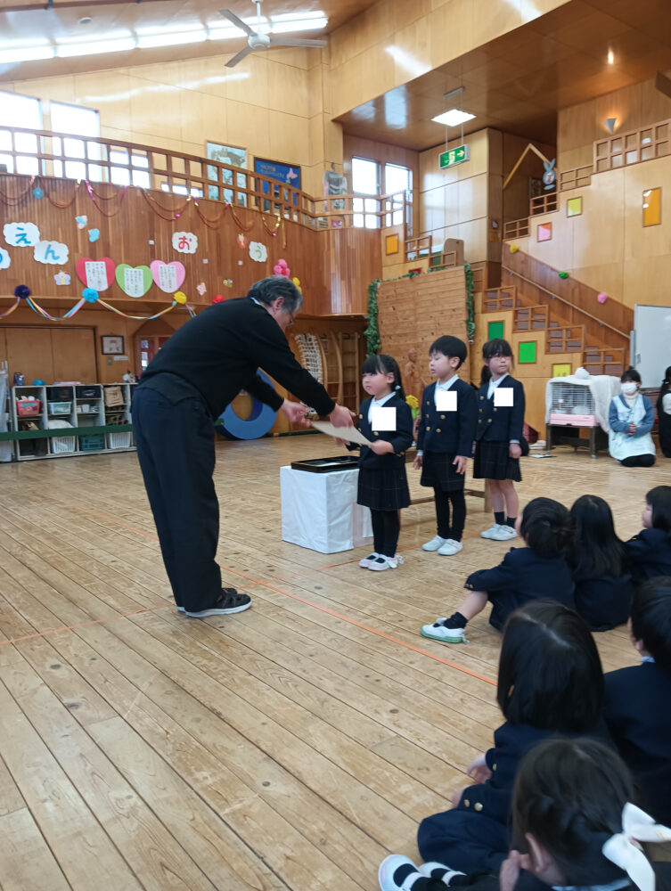 園長先生のお話をいただき、絵画で賞をとったお友だちの表彰式を行いました。賞状を受け取った子どもたちは、とっても嬉しそうな表情でした😊そして今回は、幼稚園にさようならの会も併せて行いました。来年度から園舎の改築・改修工事が始まり、今の幼稚園とはお別れになります。今までたくさん遊び、お友だちや先生と楽しい時間を過ごしてきた幼稚園が変わってしまうことを聞いた子どもたちは、少し寂しい気持ちもありましたが、新しい幼稚園になることにワクワクしていたようでした💛幼稚園にとびきりの「ありがとう」を伝え、元気な園歌を幼稚園に響かせました✨子どもたちの気持ち、きっと幼稚園にも届いたかな💖次に集まるとき、また1つ大きくなった子どもたちの姿を楽しみにしていたいと思います。