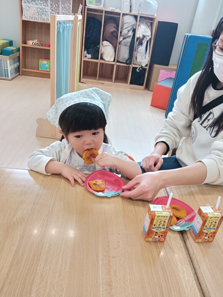 簡単で、小さなお子様と一緒にできる『かぼちゃ団子』作りをしました。かぼちゃを手でつぶすところは、「気持ちいいね~」「おもしろいね!」など、親子で会話を楽しみながら作っていましたよ。丸めて、伸ばしてからこんがり焼いて食べました。かぼちゃ好きなお友達がたくさんで、「グ~!(おいしい)」と言って食べてくれました!(^^)! 甘くてほんのりもちもちのかぼちゃ団子、ぜひ、おうちでも作ってみてくださいね!ご参加の皆様、ありがとうございました!