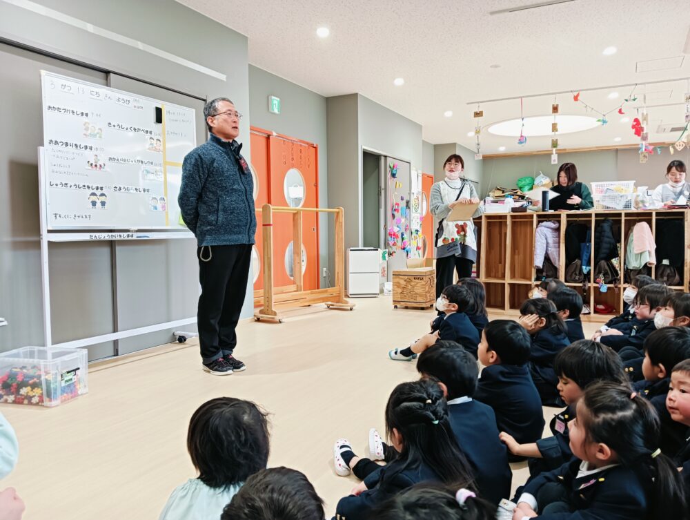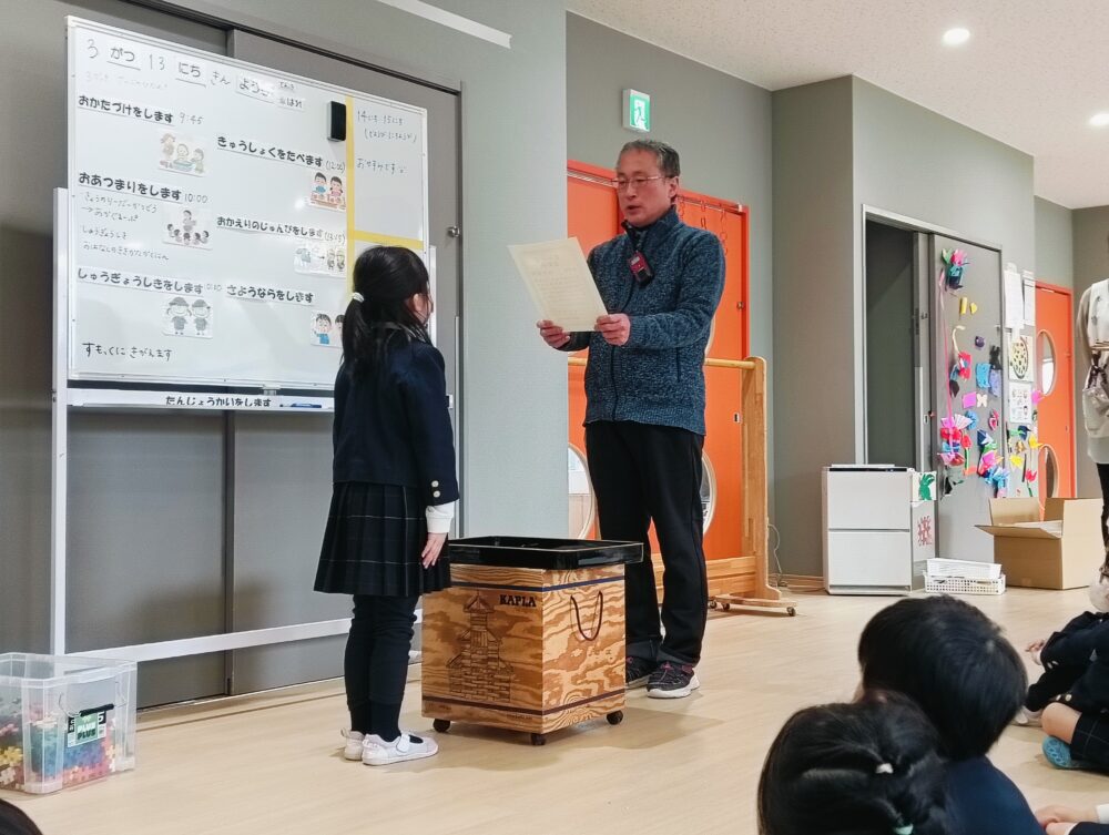 園長先生のお話をいただき、絵画で賞をとったお友だちの表彰式を行いました。賞状を受け取った子どもたちは、とっても嬉しいような恥ずかしいような表情を浮かべていました😊