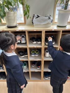下足入れの前では、靴をそろえたり、上履きに履き替えたり。