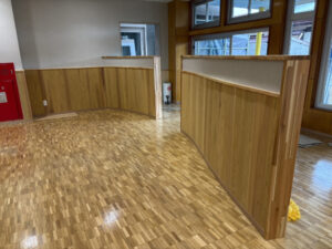 次年度に年長児が使用する予定の保育室では、腰壁の一部に県産材を取り入れました。