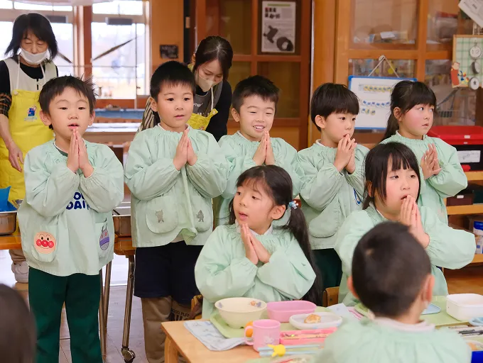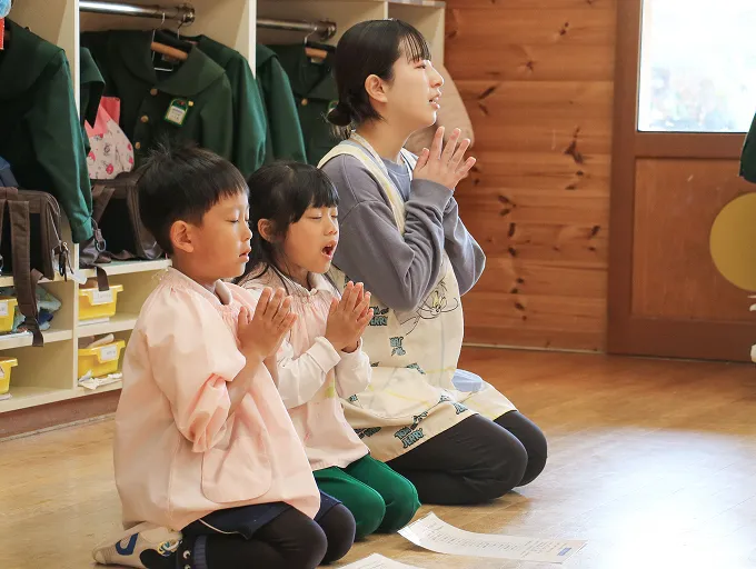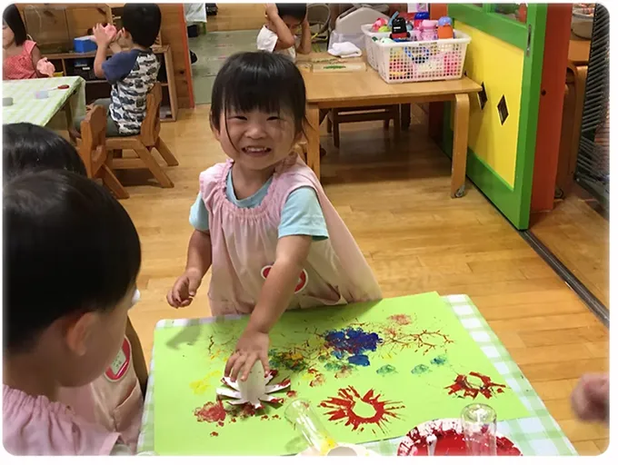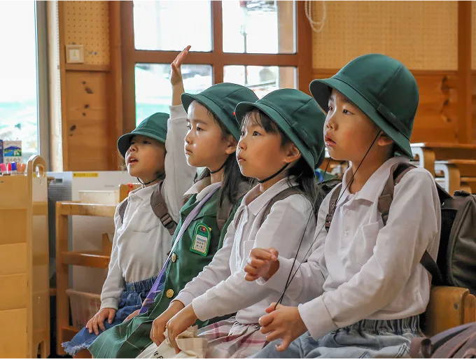 絵画や制作、ゲームや園周辺のお散歩、園バスを利用して園外にも出掛けます。​外部の講師のレッスン(体操・英語・年長は茶道)も行います。学年に応じて出席の確認や全員で朝の挨拶や季節の歌を歌います。