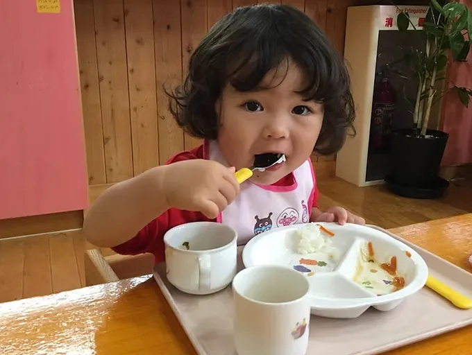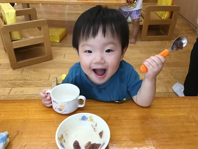 ​おいしい手作りおやつをいただきます。おやつの後は遊びの時間です。